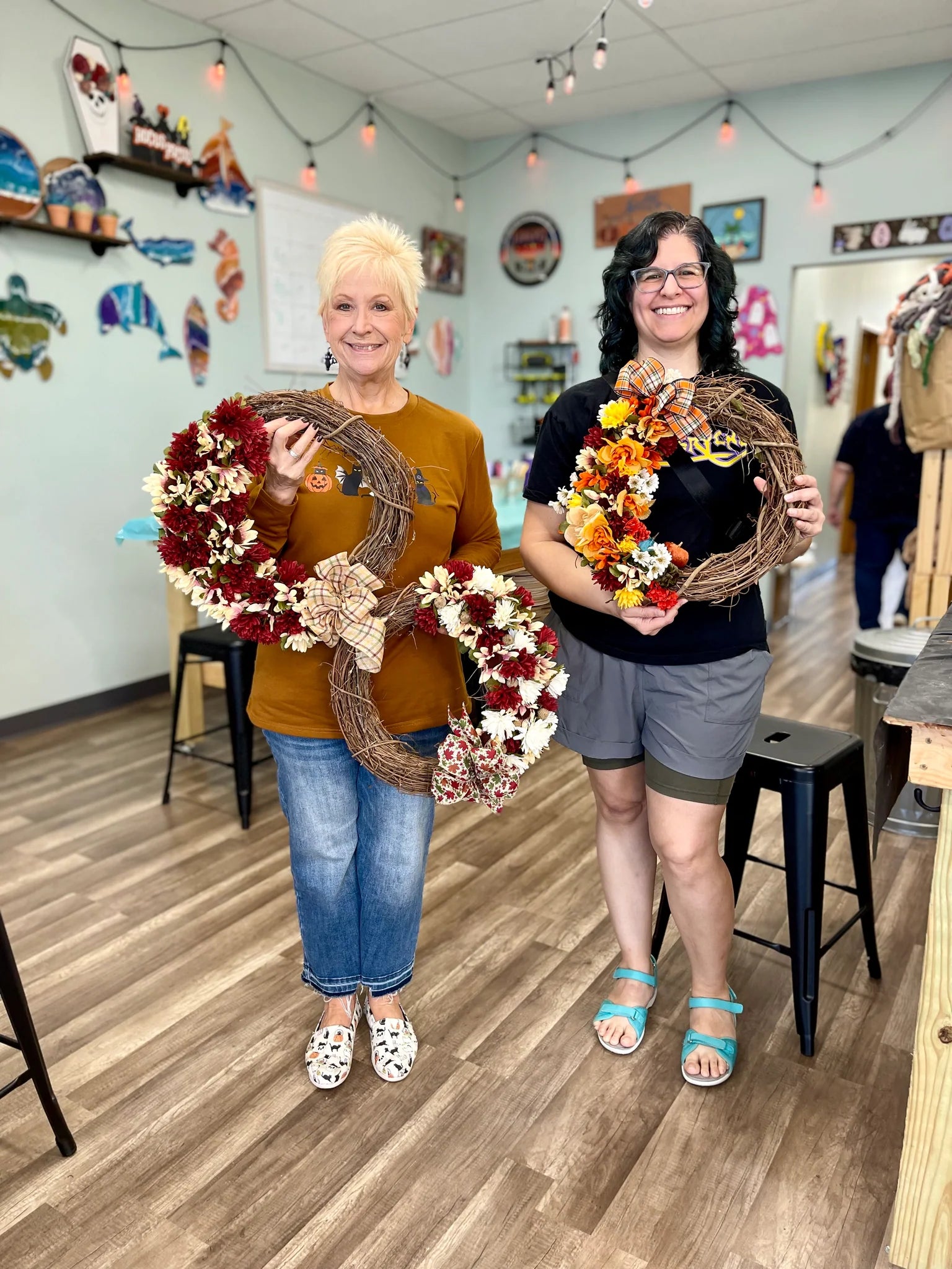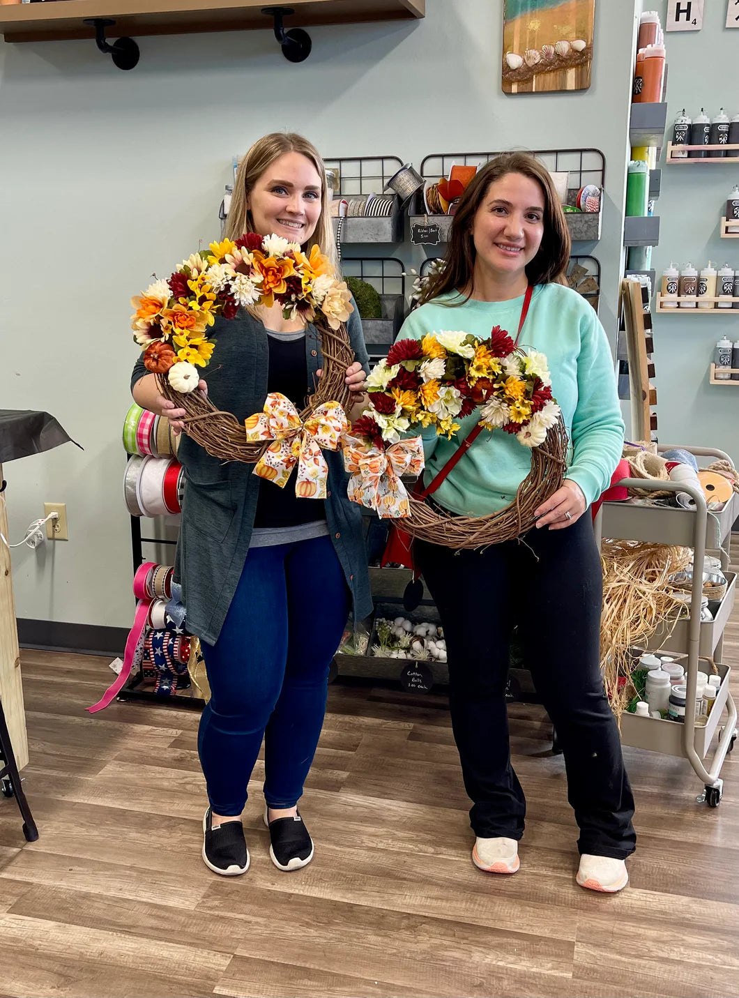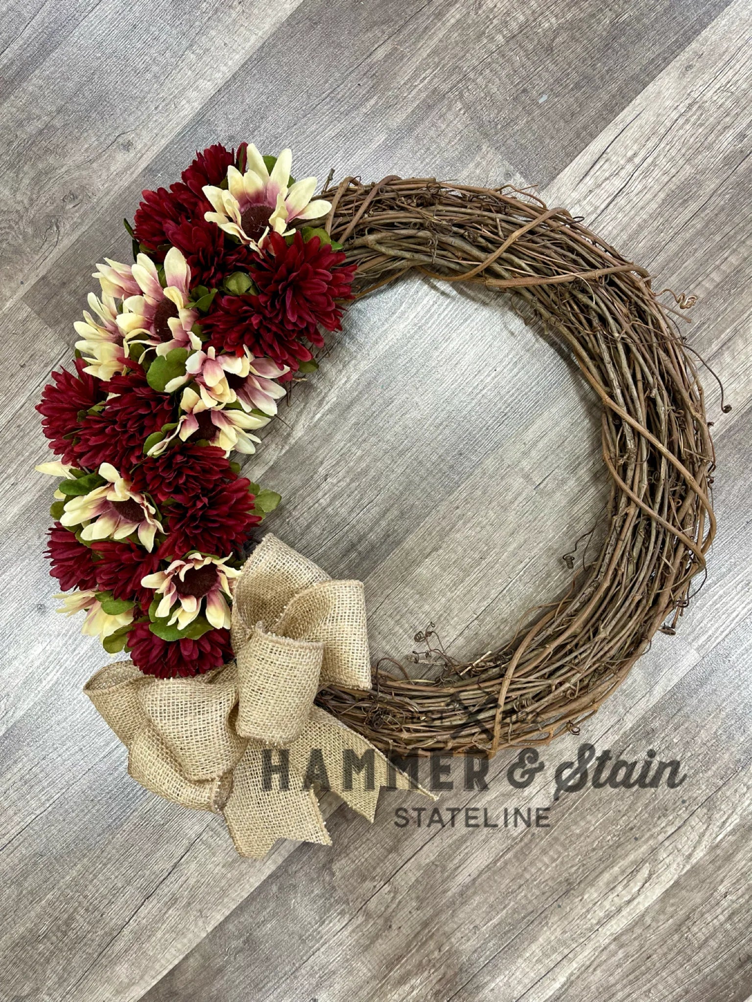 Join us to make a fall wreath featuring mums and sunflowers! We will have a variety of silk mums and sunflowers in your favorite fall hues of orange, red, yellow and cream colors. Bow is also included with this workshop.